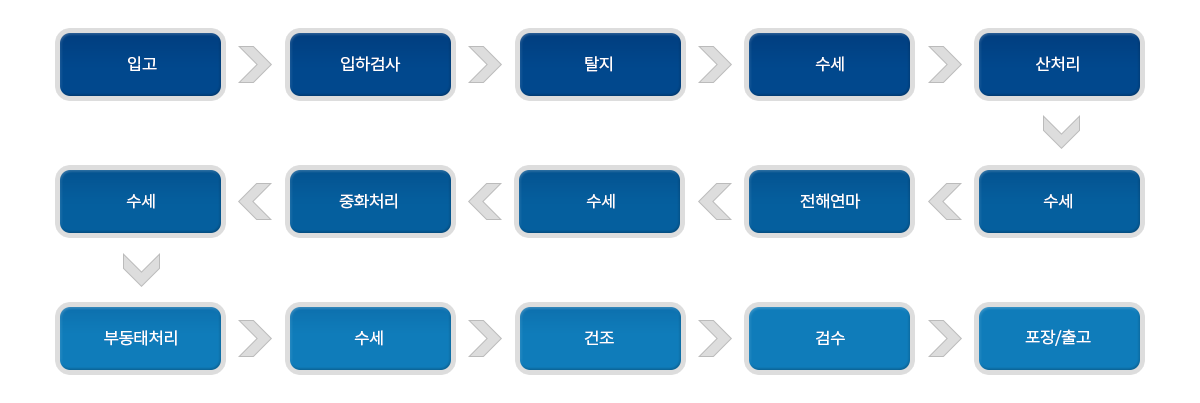1. 탈지 및 산처리(Acid Cleaning) 제품의 가공 및 용접 부위의 유분, 흑피, 산화스케일,오물 및 기타 불순물의 제거를 위한 목적으로 제품에 따라 탈지조 또는 산처리조에 완전히 침잠 시킨 후 적정한 시간을 유지하여 불순물을 완전 분해한다. 2. 수세(Washing) 탈지 및 산처리조에서의 불순물이 분해된 제품을 250Bar 이상의 고압세척기를 이용 제거한다. 표면 및 틈새속에 남아 있는 각종 이물질 및 산용액을 완전히 수세하여 제거한다. 3. 전해연마(E.P) 전해연마를 하고자 하는 제품을 깨끗한 물로 세척 후 제품을 양극에 접지하여 전해액 중 전자가 양극에서 음극으로 이동하는 원리를 이용 연마작업을 행한다. 이때 제품의 재질 및 생김새등에 따라 적절한 시간, 온도, 전류, 전압을 유지하여야 하며 필요에 따라서 적절한 극판사용을 병행한다. 작업시 특히 접지 부분의 불량으로 인한 제품의 손상에 주의한다. 4. 중화처리(Neutralization) 연마 후 제품에 묻어 있는 전해액의 중화가 주목적으로 중화 산액이 있는 중화조에 침잠 시킨 후 제품에 따라 적정한 시간을 가져야 하며 필요시 브로아 작업도 병행한다. 충분한 시간을 가진 제품에 대하여 수세공정을 행하며 이때 물 얼룩등에 주의 하여야 한다. 부동태 처리가 필요한 제품에 대해서는 부동태 공정을 행한 후 수세한다. 5. 건조(Drying), 검수(Inspection) 물 얼룩등에 주의하여 자연건조를 원칙으로 하되 필요시 Heating 또는 건조로를 이용한다. 검수시 제품의 찍힘 또는 표면의 수세상태, 평활도, 조도등 필요한 장비를 사용하여 행한다. 6. 포장(Packing)출고(Shipment) 포장은 제품의 특성에 가장 적합한 형태를 선택하여야 하며 출고 시 제품 보양에 최선을 다한다.